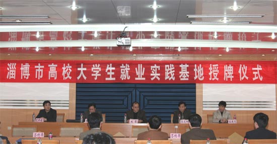本站讯 3月24日,淄博市高校大学生就业实践基地授牌仪式在我校举行。我校和山东大学、中国海洋大学、石油大学等10家高校毕业生就业工作负责人、齐鲁石化公司、东岳化工集团等10家单位的人力资源部门负责人参加了仪式。我校副校长姚德、招生就业处处长艾修俊,淄博市人事局局长张守华、淄博市委组织部孙庆元主任等领导出席签约仪式并为签约基地授牌。
