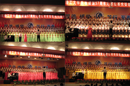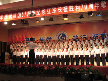 本站讯 9月27日晚7点,由校工会主办,音乐学院和后勤管理处协办的“庆祝建国57周年纪念红军长征胜利70周年歌咏比赛预赛(第二场)”继续在3号楼报告厅进行。音乐学院副院长井华教授、理论教研室主任刘秀荣教授、键盘教研室主任陈霖副教授及校工会、音乐学院、一年级工作部等部门的老师担任此次比赛的评委。部分教职工及学生共六百余人到场观看。