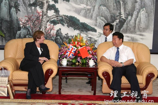本站讯 10月16日,由帕梅拉.吉利斯校长率领的英国格拉斯哥加利多尼亚大学代表团一行6人来我校参观访问。我校党委书记范跃进,党委常委、副校长王学真与代表团见面并就该校与我校及山东大众文化产业投资公司的三方合作事宜进行了深入座谈。