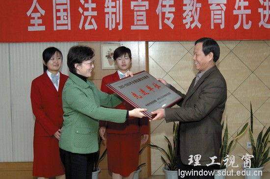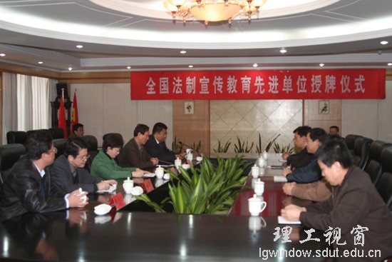 本站讯 近日,中共中央宣传部、国家司法部联合下发决定,对2001年至2005年全国法制宣传教育先进集体和先进个人进行表彰,我校荣获全国法制宣传教育先进单位称号,成为山东省教育系统获此殊荣的唯一高校。12月5日,也即第六个“全国法制宣传日”的第二天,授牌仪式在鸿远楼9楼会议室举行。省教育厅副厅长黄琦向我校授牌,校党委副书记、副校长张新义代表学校接牌。