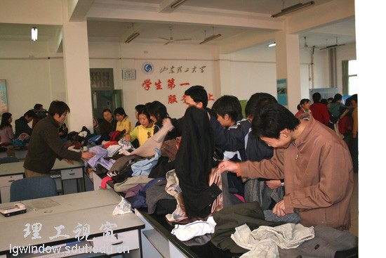 本站讯 12月10日,山东理工大学2006年“爱心超市”捐赠活动如期举行,4000余名持有校园绿卡的同学到场并领取了棉衣、方便面、文具等物品。