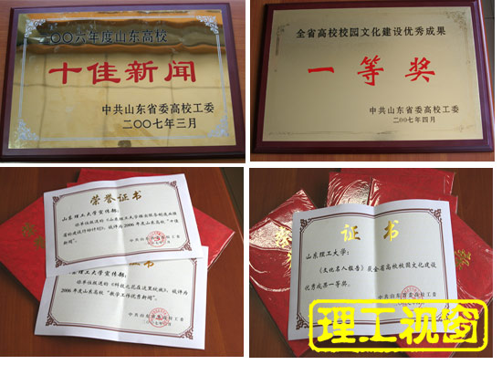 本站讯 近日,中共山东省委高校工委对“2006年度山东高校十佳新闻”和“全省高校校园文化建设优秀成果”进行了表彰,我校从全省高校激烈的竞争中脱颖而出,2006年5月30日由新华社刊发的《山东理工大学推出服务制造业强省建设行动计划》获“2006年度山东高校十佳新闻奖”, 我校校园文化建设成果《文化名人报告》获“全省高校校园文化建设优秀成果一等奖”,成为同时获得此两项奖为数不多的高校之一。同时,2006年12月18日我校发表于光明日报的《科技之花在这里绽放》获“山东高校教学工作优秀新闻”。