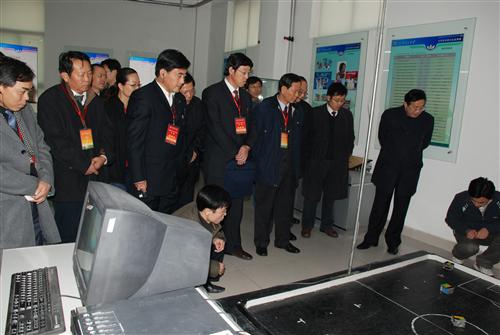 在大学生科技文化成果展厅,专家组参观了我校大学生近年来在科技学术、文学艺术、体育竞技等方面取得的成绩,足球机器人和自动灭火器的现场演示吸引了专家组驻足观看。