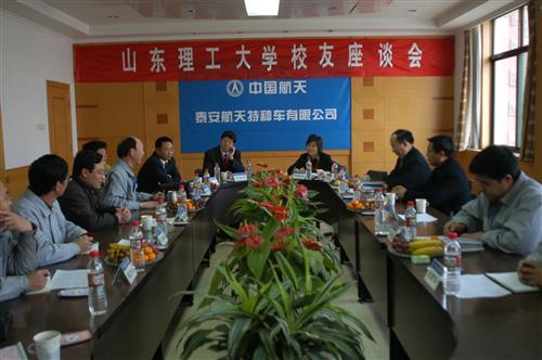 10:00,会议一结束,许晓革教授、孙振国教授立即来到公司办公楼314会议室,组织召开山东理工大学泰安校友代表座谈会,来自泰安航天特种车有限公司、泰安市农机研究所、泰安市电业局、泰安市国有资产经营有限公司、泰安市开发区管委会、中国重汽东岳专用汽车厂6个单位的10位毕业生参加了校友座谈会,孙振国教授主持座谈会。10位校友结合各自的大学学习经历、个人成长成才的历程,表示母校的严谨治学、教师的严格要求、老师教给的做人准则,深深地影响着自己,使自己不仅掌握了扎实的专业知识,更让自己收获了更多的专业知识之外的东西,使自己终生受益。他们在讲述自身感受和体会的同时,更深深地表达了对母校的热爱和感恩之情。