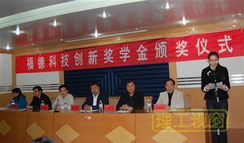 “福德”科技创新奖学金是由我校校友房富民先生创建的山东福德科技有限公司一次性出资壹百万元人民币作为本金设立的,用基金本金每年的利息伍万元奖励品学兼优、在科技创新方面有突出成绩的优秀学生。2007年度福德科技创新奖学金共评出特等奖1名,一等奖3名,二等奖9名,三等奖13名,其中特等奖获得者获得人民币壹万元的奖励。