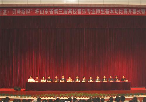 本站讯 5月18日晚,由省教育厅主办,我校承办,淄博市教育局协办的“三益 贝希斯坦”杯山东省第三届高校音乐专业师生基本功比赛在我校大学生艺术中心礼堂开幕。省教育厅副厅长陈光华,淄博市副市长段立武,我校党委书记都光珍,党委副书记、副校长张新义,副校长谭秀森以及教育厅体卫艺处、淄博市教育局等单位负责人出席开幕式。大赛组委会成员、各参赛院校的部分师生代表共1200余人参加了开幕式,开幕式由教育厅体卫艺处处长任兰平主持。