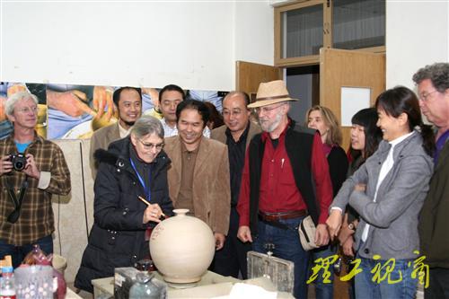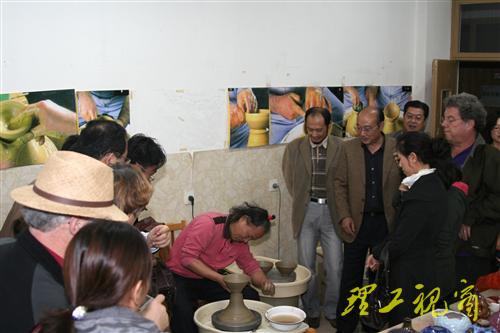杜瑞成向各国际陶艺大师介绍了校园布局,陪同他们参观了校园、美术学院陶艺工作室和学生刻画作品展。学校的规划、建设、教学条件、师生作品等给各国际陶艺大师留下深刻印象,大师们纷纷拿出相机留下美好的记忆。