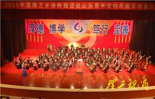 本站讯 走近大师,聆听经典,陶冶情操,提高修养。11月5日晚7:30,“2008年高雅艺术进校园” 山东青年交响乐团专场音乐会在我校大学生艺术中心礼堂举行。省教育厅体育卫生与艺术教育处调研员张德珠、山东艺术学院党委书记柳文敏、淄博职业学院党委书记鹿林,我校党委书记都光珍、副校长杜瑞成与我校近2000名师生共同分享了这道高雅音乐的大餐。