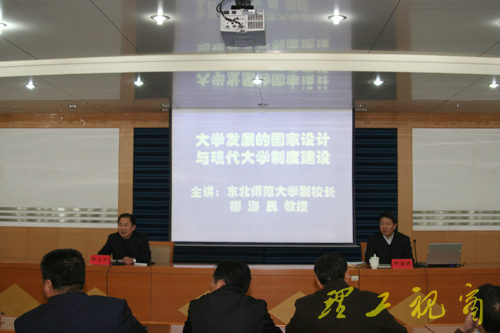 党委书记都光珍在讲话中指出,柳海民教授就大学发展从国家设计到这种设计所期望实现的建设目标,以及围绕目标的实现如何加强大学制度建设作了一场精彩的报告,特别是结合东北师范大学10年的实践,重点就教授委员会制度进行了系统讲解,对我校的制度建设具有很好的借鉴意义。大学制度是大学管理与运行的规则体系。因此,办大学必须研究如何科学设计大学制度,如何不断完善管理的运行规则。学术性是大学最本质的特征。衡量一所大学办学水平的高低,主要看其学术水平的高低。东北师范大学的实践证明,教授委员会制度是强化学术权力,营造学术环境,提高学术水平,保证大学学术性本质特征的有效制度形式。这一制度,对体现教师的主体地位,发挥教授治学育人作用,加强高层次教师队伍建设都产生了积极而深远的影响。