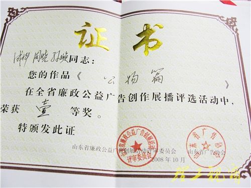 本站讯 近日,由中共山东省纪委、省委宣传部、省监察厅、省文化厅、省建设厅、省工商行政管理局和省广播电视局等单位联合主办的“扬正气,促和谐”廉政公益广告创作展播评选活动获奖情况揭晓,在全省各市各单位推荐的一千多件参评作品中,经有关专家组成的评审委员会认真评审,我校文学与新闻传播学院学生成科、周晓、孙璇的广播类参赛作品《公物篇》荣获一等奖,张雪飞的平面类参赛作品《真理》荣获二等奖。我校是参加本次活动高校中荣获一等奖奖项的几所院校之一。