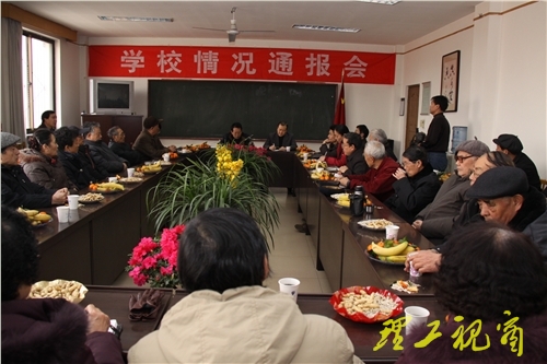 1月16日,学校还在离退休工作处会议室召开了离退休老干部情况通报会。校领导张宗新、贺连春代表校党委、校行政向全校离退休老领导、老教授、老同志们表示了衷心的感谢和崇高的敬意,从教育教学质量、学科建设和科研水平、校内管理体制改革、师资队伍建设、学生教育管理服务、对外交流合作、党建和思想政治工作等方面通报了学校2008年的工作情况,介绍了学校2009年将开展的几项重点工作,向老同志们征询关于学校建设和发展的意见和建议,并向老同志们送上了新春佳节的美好祝愿。