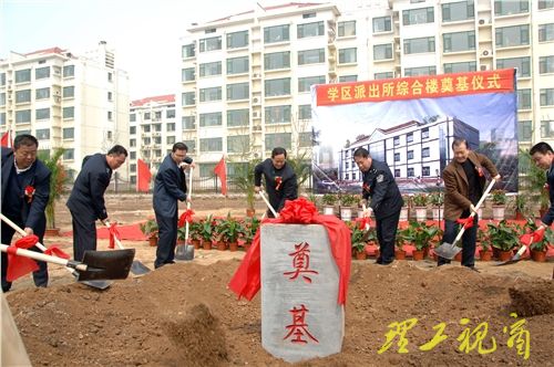 在鞭炮声中,出席仪式的领导纷纷拿起铁锹为学区派出所综合办公楼奠基。
