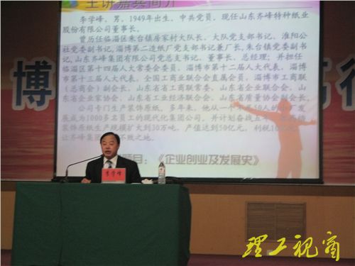 此次活动邀请到淄博市企业家孙文亭、李学峰、王晓武为我校学生就有关大学生创业等问题做了精彩演讲。首先,山东过桥缘餐饮连锁经营有限公司总经理孙文亭以“大学生拿什么迎接挑战”为主题给同学们做报告。在简单介绍自己的公司之后,她分析了近几年全国大学毕业生就业率对比数据,认为大学生要改变之前的思维模式,分析自身的优、劣势,积极准备,充满自信地去就业、创业。随后,山东齐峰特种职业股份有限公司董事长李学峰做题为“企业创业及发展史”的报告。在报告中,他着重介绍了自己企业的发展历程,并讲述企业发展过程中所遇到的挫折及解决途径等问题。在去年经济危机大背景下,他的企业依然持续增长,逆势而上。他认为企业的发展要靠文化,在组织员工培训的同时,也要不断加强自己的学习。针对当前大学生就业难的问题,李学峰告诫学生们要立足专业、脚踏实地,从小事做起。他还以“创业改变命运,励志照亮人生”、“贵在坚持,永不放弃”等话语激励同学们努力学习,敢想敢做。他朴实的话语,饱含对学生们的鼓励与支持,其幽默的话语博得阵阵掌声。最后,山东大地人律师事务所合伙人会议副主任王晓武针对大学生就业与维权作报告。他鼓励同学们要提高法律维权意识,学习成功人士的经验,以应对复杂的社会,为就业做好准备。