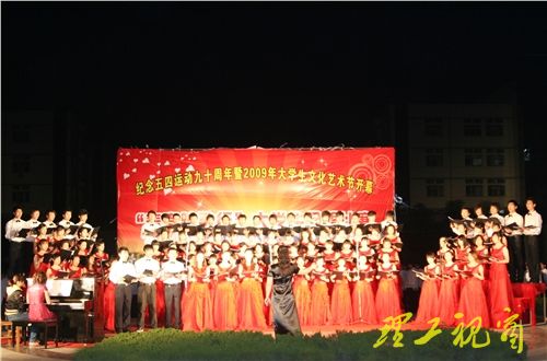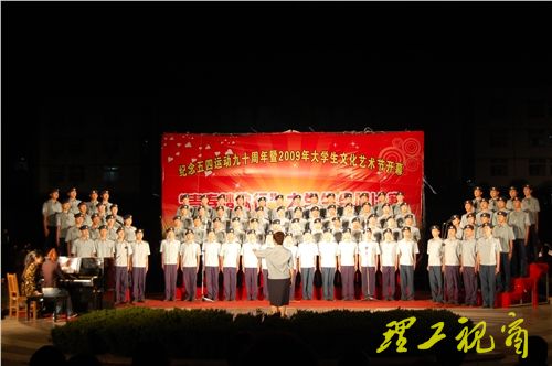 本站讯 4月23日晚,纪念五四运动九十周年暨2009年大学生文化艺术节开幕——“青春踏歌行”第六届大学生合唱比赛在大学生艺术广场举行,共有16个学院的代表队参加了此次合唱比赛。