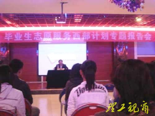 据悉,此次专题报告会是我校2009年西部志愿者招募工作其中一项。在前期宣传工作中,我校团委已在“理工青年”网站开通“大学生志愿服务西部计划”专题(http://www.lgqn.cn/ztjj/xbzyz/),全面介绍我校大学生志愿服务西部计划实施情况。此外,毕业生志愿服务西部计划相关文件已下发至各学院,各学院积极积极开展本学院的志愿服务西部计划相关工作。为配合相关工作,我校青年志愿者协会该协会还组织了西部志愿者招募工作培训会,并在我校各人流密集处分别悬挂条幅以及展板并组织相关人员进行集中宣传,以更好推动我校大学生志愿服务西部计划工作的开展。