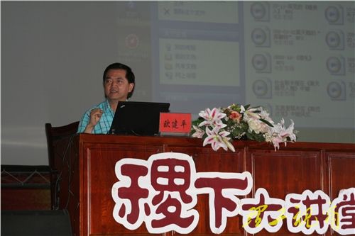 “舞蹈是人类的艺术之母”,欧建平开场如是说。作为舞蹈中必不可缺的一支,他首先从历史发展的角度向大家介绍了芭蕾的发展,将芭蕾史上的五大时期、六大门派及“三夫三娃”等知识给大家一一作了介绍。对于欣赏芭蕾的基本方法,欧建平则通过一段顺口溜让大家轻松掌握。随后,欧建平用经典解析的方法,以讲解与观赏相结合的方式通过几段经典芭蕾舞段分开进行分析,在《吉赛尔》里,他告诉大家要学会对于演员的神态、举止以及心理进行捕捉分析;通过《烟》这幕芭蕾哑剧,欧建平则论述了舞台布景、道具及景深的运用所带来的舞台效果,同时他还将这些芭蕾舞所要表达的对生活的态度与现场观众进行交流。最后,针对大家提出的一些问题,欧建平做了耐心细致的回答,特别是在谈到中国的芭蕾水平及在世界所处的地位时,他语重心长的讲到,虽然中国当代的芭蕾水平已经有了很大的提高,但是距离世界顶尖水平还有一定差距,他希望大家都能够更加关注芭蕾,更多接触芭蕾,通过这种艺术来提升自身的修养和气质。
