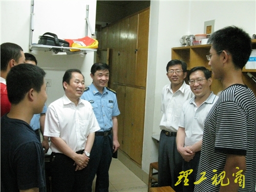 本站讯 7月1日晚,校党委书记都光珍、副校长谭秀森深入学生宿舍,看望慰问2009届毕业生,并为他们送去了美好祝福。学生工作处、国防教育学院、空军选培办、公寓管理中心负责人一同参加。