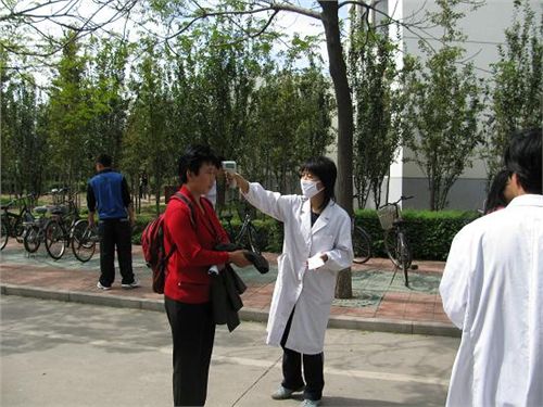 第三,在新生报到现场,本网记者遇到了山东理工大学校医院的徐院长,徐院长正带领几个医生拿着体温检测仪对一名学生家长进行体温检测。据徐院长介绍,在通往学生宿舍区的道路上,医护人员对每一位体温正常人员发放体温正常的检测证件。只有领到此证的新生才可办理宿舍入住手续。