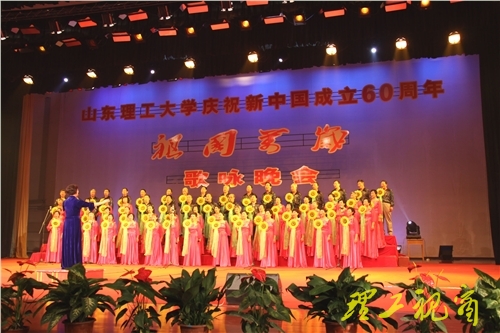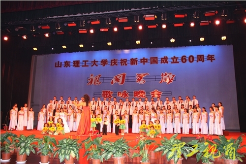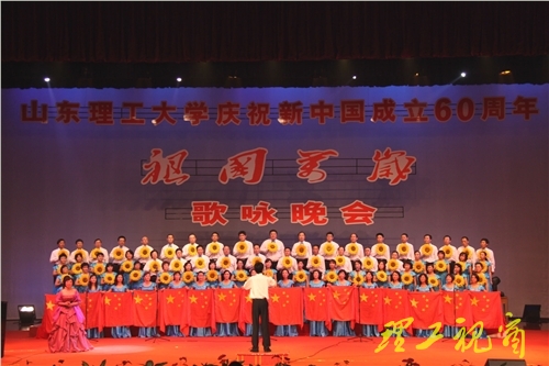 在举国欢庆新中国60华诞之际,我校举行以“歌颂伟大祖国,肩负神圣使命”为主题的庆祝新中国成立60周年“祖国万岁”歌咏比赛,旨在抒发师生员工的爱国情怀、歌颂我们伟大的祖国、凝聚理工精神。此次歌咏比赛由校工会主办,音乐学院、后勤管理处协办。各基层分工会积极响应,主要负责人亲自组织并带头参加排练和演出,广大师生热情高涨,利用业余时间提前排练、积极组织参加比赛,用昂扬向上、开拓奋进的精神面貌向我们伟大的祖国献礼。音乐学院的师生积极帮助各代表队排练,部分学生承担了所有参赛代表队的指挥工作,付出了辛勤的劳动。