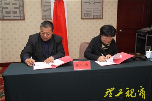 副校长张元利、淄博市律师协会会长关玛琍分别代表双方签订成立淄博律师学院协议书。