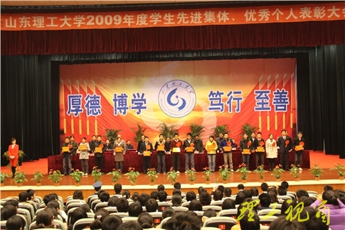 大会在庄严的国歌声中拉开帷幕。学生工作部负责人宣读了《山东理工大学关于表彰2008—2009年度学生先进集体、优秀个人的通报》和《关于表彰2009年度国家奖学金获奖学生的通报》。教务处负责人宣读了《山东理工大学关于表彰2009年大学生科技创新标兵与先进个人的通报》。