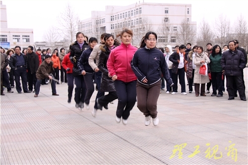 3月8日下午3∶30,在鸿远楼前广场,举行了庆“三八”趣味体育比赛活动。比赛分团体跳大绳和踢毽入筐两个项目,共有34个代表队、470余名队员参加了此次比赛。最终,电气与电子工程学院代表队和后勤管理处代表队分获跳大绳和踢毽入筐项目第一名,女教职工们在欢声笑语中度过了一个愉快的节日。