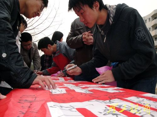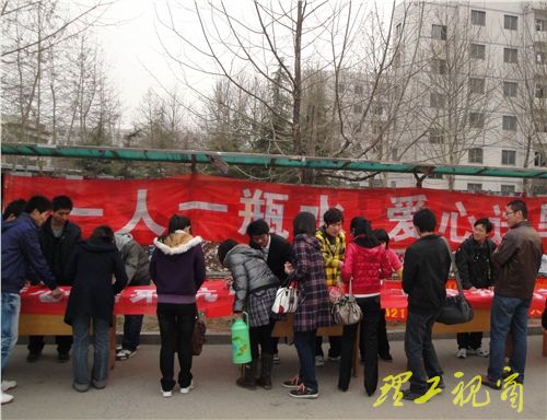 本站讯 近期,我国西南地区遭遇了百年一遇的特大旱灾,旱区人民的生产生活受到严重影响,全国各地纷纷伸出援助之手支援旱区。为号召广大学生关注关心旱区人民的生产生活,积极向旱区捐款献爱心,3月27、28两日,校学生会组织开展了“一人一瓶水,爱心献旱区”签名活动,活动得到了同学们的积极响应。