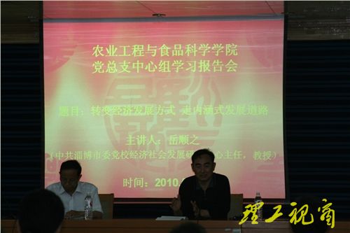 本站讯 5月13日下午,农业工程与食品科学学院在鸿远楼一楼报告厅举行党总支中心组学习报告会。邀请中共淄博市委党校经济社会发展研究中心主任、教授岳顺之带来了题为《转变经济发展方式,走内涵式发展道路》的精彩报告。该院党总支中心组成员及部分师生参加了此次报告会。报告会由该院党总支书记张思灵主持。