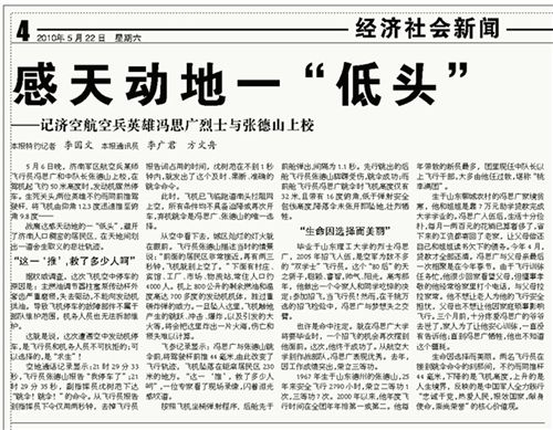 5月6日晚,济南军区航空兵某师飞行员冯思广和中队长张德山上校,在驾机起飞约50米高度时,发动机骤然停车。生死关头,两位英雄不约而同前推驾驶杆,将飞机由仰角12.3度迅速推至俯角9.8度——战鹰这感天动地的一“低头”,避开了济南人口稠密的居民区,在天地间划出一道舍生取义的悲壮轨迹。