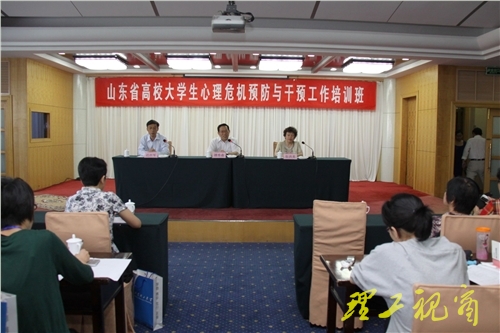 谭秀森致开幕词,他代表学校党委、行政对培训班学员的到来表示热烈的欢迎,并简要介绍了我校的总体发展情况和学校多年来在大学生心理危机与干预工作方面采取的一些做法以及取得的成绩,希望通过承办这次培训班加强山东理工大学与兄弟院校之间的交流学习,共同提高我省高校大学生心理健康教育的工作水平。