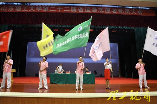 动员大会上,校团委副书记赵明汇报了我校省运会志愿者相关工作。 校团委书记王介忠为我校第二十二届省运会志愿者网球项目志愿者服务队、链球项目志愿者服务队、田径项目志愿者服务队、游泳跳水项目志愿者服务队、礼仪志愿者服务队和城市志愿者服务队授旗;相关与会人员还为我校省运志愿者颁发省运会志愿者录用通知书。志愿者代表2007级学生石立代表省运会志愿者发言,并带领全体志愿者进行庄严宣誓:“遵守纪律,服从安排;按时上岗,真诚服务;举止文明,热情周到;尽职尽责,甘于奉献,真正践行‘奉献、友爱、互助、进步’的志愿精神,为传播先进文化,构建和谐社会,推动淄博城市发展贡献自己的青春力量。”