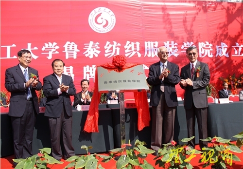 季国标院士、王顶岐副市长、李乃熺总经理、李金宝会长共同为鲁泰纺织服装学院揭牌。