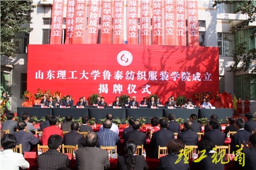 本站讯 秋枫吐艳,硕果盈枝。10月9日上午,山东理工大学鲁泰纺织服装学院成立揭牌仪式在1号教学楼南侧广场隆重举行,中国工程院院士季国标,淄博市委常委、常务副市长王顶岐,鲁泰纺织股份有限公司董事长刘石祯、总经理刘子斌,山东省教育厅高教处副处长曾宪文,香港联业制衣有限公司董事总经理李乃熺,中国印染行业协会会长李金宝,中国棉纺织行业协会会长朱北娜,武汉纺织大学副校长徐卫林,山东理工大学校长张新义,副校长王学真,校长助理邹广德出席揭牌仪式,淄博市政府办公厅、山东省纺织工业协会、瑞士科莱恩公司大中华地区相关负责人、鲁泰纺织股份有限公司各部门负责人、山东理工大学相关单位负责人以及部分学生代表参加了揭牌仪式。仪式由王学真主持。
