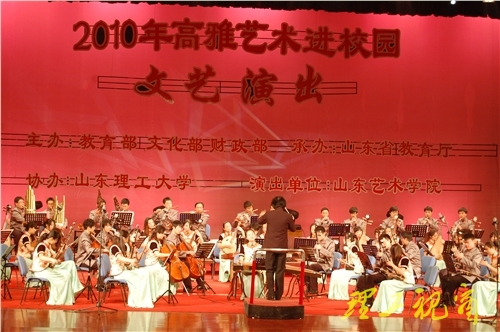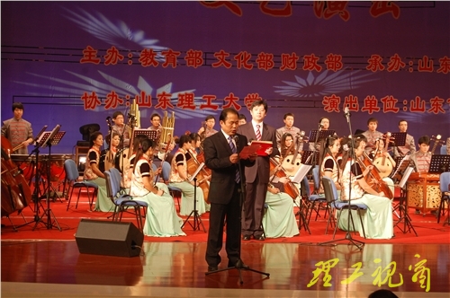 演出开始前,都光珍代表全校师生向前来演出的山东艺术学院民族乐团表示热烈欢迎。他指出,高雅艺术走进以理工科为主的山东理工大学将推动校园文化建设,增强学生的艺术修养和文化修养。随后,柳文敏致辞,他说,山东艺术学院将精心选择、排练、加工的首场音乐会奉献给山东理工大学的师生,增进了友谊,加强了交流。