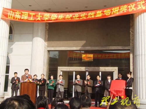 本站讯 12月1日上午,“山东理工大学学生就业实践基地”揭牌仪式在淄博市规划信息中心隆重举行 。淄博市规划局局长徐建祥、副局长杜春雷、信息中心主任巩军昌、我校招生就业处处长艾修俊、建筑工程学院党总支书记李新红、院长曲国庆等出席了此次揭牌仪式。