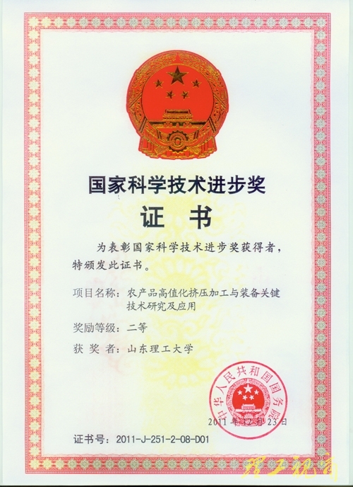 我校与江南大学等单位合作完成的“农产品高值化挤压加工与装备关键技术研究及应用”成果获国家科学技术进步二等奖,申德超教授代表我校参加了国家科技奖励大会,这是2006年以来我校第五次获得国家科学技术奖。近日,教育部向我校发来了贺信。 “农产品高值化挤压加工与装备关键技术研究及应用” 针对我国挤压技术研究起步晚,装备落后,挤压技术应用面窄,挤压设备产量小、关键部件寿命短、自动化程度低、适应能力差等问题,以挤压技术为出发点,经过15年的努力,在稳态化挤压与成型技术、挤压催化与生物转化技术、螺杆柔性组合与压力-温度分段控制技术、高性能系列化挤压机的制造技术等方面取得了突破。