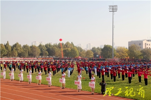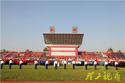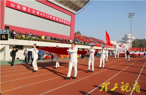 在雄壮的国歌声和激越的校歌声中,鲜艳的五星红旗和我校校旗相继升起在第二体育场上空。随着党委书记都光珍宣布“山东理工大学2012年秋季田径运动会开幕”,一声声礼炮,响彻云霄,运动会会旗在会歌声中冉冉升起。