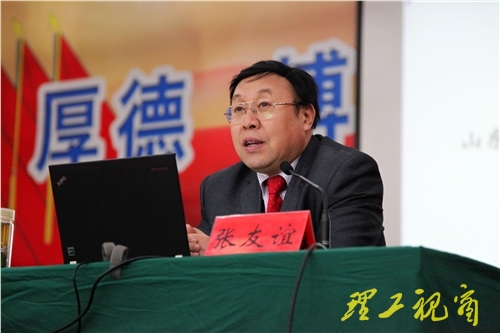 本网讯 3月27日下午,学校在3号教学楼报告厅举行学习十八大精神辅导报告会,山东省委党校哲学教研部主任张友谊教授应邀为我校师生作了一场学习十八大精神体会的辅导报告。校领导都光珍、张宗新、张元利、张宇声、衣玉琛、吕传毅,全体处级干部,各党支部书记聆听了报告,党委组织部部长刘国华主持报告会。