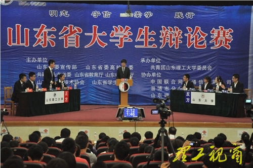 本网讯 5月26日,由省委宣传部、省委高校工委、共青团山东省委、省教育厅、省文化厅、省科学技术协会联合主办,我校团委承办的“联通沃派”杯山东省大学生辩论赛在三号教学楼报告厅圆满落幕,我校代表队力克群强夺得冠军。