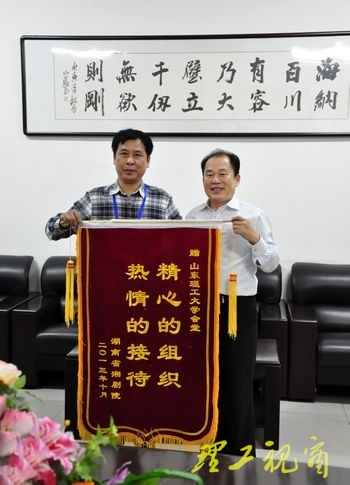 学校高度重视“十艺节”承演工作,在淄博市委、市政府的大力支持下,高质量地完成了大学生艺术中心的设施改造建设任务,密切做好协调配合工作,积极做好各项服务准备。在本次正式演出前,湖南省湘剧院负责人特为我校送来“精心的组织,热情的接待”锦旗,校党委书记都光珍代表学校接受了锦旗,并表示学校将在“十艺节”各相关部门的指导下,继续精心做好服务工作,为“十艺节”展演工作做出积极贡献。