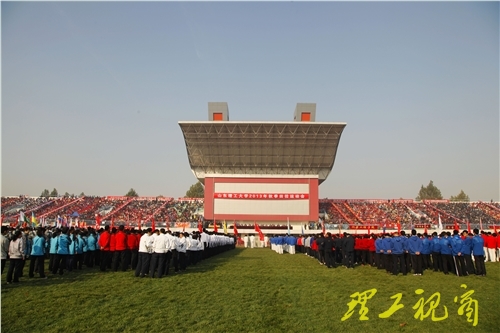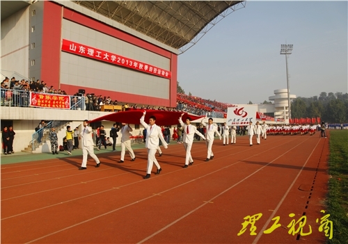 在雄壮的国歌声和激越的校歌声中,鲜艳的五星红旗和我校校旗相继升起在第二体育场上空。随着党委书记都光珍宣布“山东理工大学2013年秋季田径运动会开幕”,运动会会旗在会歌声中冉冉升起。
