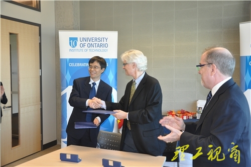 在加拿大安大略省理工大学访问期间,我校代表团与该校相关单位负责人座谈并就学生交流、教师交流以及科研合作等合作项目进行了详细探讨。代表团一行重点参观了该校的卓越汽车中心以及机器人与自动化实验室,并就各实验室的运行和管理情况与相关负责人进行了互动交流。在前期沟通交流和参观考察的基础上,两校举行了合作备忘录签署仪式,邹广德与该校校长蒂姆·麦克蒂尔南博士分别代表两校在备忘录上签字,标志着两校间合作交流关系的正式建立。同时,我校代表团还与加拿大特伦特大学国际项目主任迈克尔·奥尔科特教授就双方关心的问题进行了充分交流。