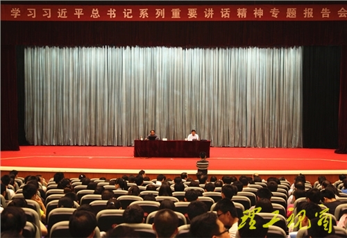 本网讯 党的十八大以来,习近平总书记发表了一系列重要讲话,深刻阐述了党和国家发展的一系列重大理论和实践问题。为加深对习近平总书记系列重要讲话的理解和精神实质的准确把握,5月19日,学校特邀山东大学王韶兴教授为我校师生作专题辅导报告。
