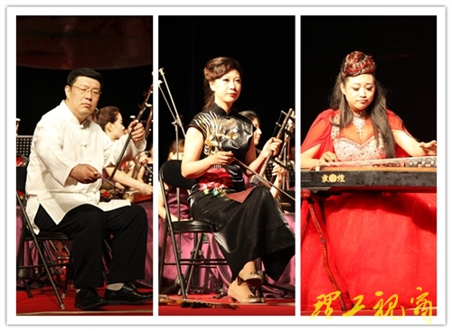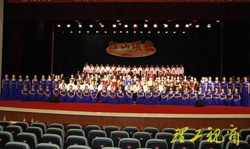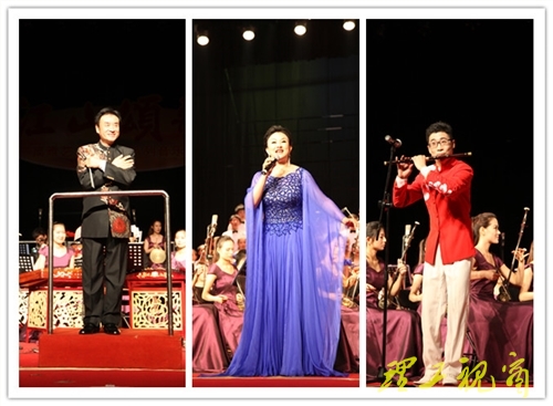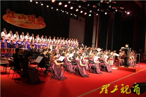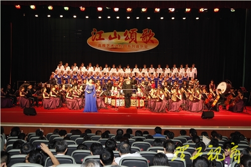 演出在慷慨激昂的大合唱《把一切献给党》中拉开帷幕,民族管弦乐《北京喜讯到边寨》、《红楼梦序曲》、《金蛇狂舞》,二胡《二泉映月》,笛子协奏《向往》,京胡协奏《京剧曲牌》,男声独唱《儿行千里》、《得民心者的天下》以及我校音乐学院师生奉上的合唱《赶牛山》、古筝协奏《临安遗恨》等经典曲目一一呈现,演员们酣畅淋漓地诠释着音乐的美感,展示着高雅艺术的魅力,感染了全场的每一位观众,赢得阵阵热烈的掌声。音乐会伴随着大气磅礴的民族管弦乐与合唱《江山颂歌》达到最高潮,在观众经久不息的掌声中圆满落下帷幕。