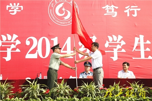 张祥云代表学校向军训团授旗。他在讲话中简要介绍了学校的总体情况,并就做好这次军训工作提出了希望和要求: