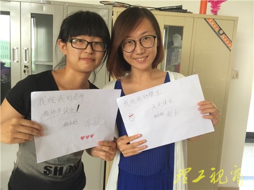 建筑工程学院的学生代表将写满祝福和寄语的木马编签及精美明信片等礼物送给老师,送完礼物老师与学生合影留念。合影形式新颖独特,老师和学生各手持一张白纸在胸前,纸上是搞笑又有深意的对话。例如,学生:“老师您的字写的真帅。”老师:“字如其人。”之后同学们向老师展示写满祝福标语的展板。