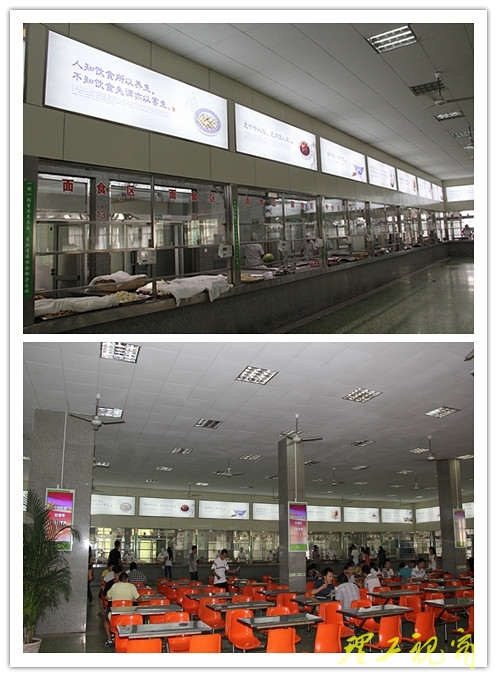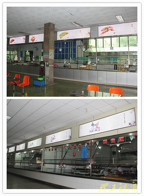 焕然一新的就餐大厅整洁明亮,环境舒适,墙面装饰或新颖活泼或稳重典雅。除了灯箱,还张贴了簇新的喷绘,增添了许多极具教育意义的标语、格言等;分屏机、投影仪也投入使用,可滚动播出校园通知、温馨提示,转播国内外新闻、人文节目、体育竞赛等,营造了开放的就餐氛围,使餐厅成为一扇生动的信息窗口、教育窗口和文化窗口,形成一个活跃的校园论坛。