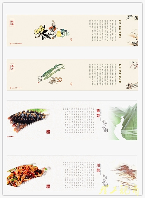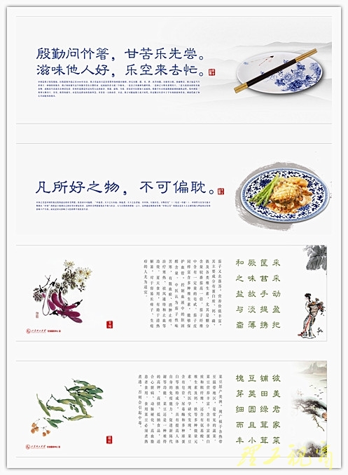 此次灯箱设计选取“24节气”、“中华好诗词”、“青花瓷”3个主题:24节气是古代劳动人民智慧的结晶,是人与自然最为亲切的交流,顺应节气的健康饮食是中国人独特的养生之道,以浓而不艳的国画表现节令美食,配以“东风 解冻 鱼上冰”、“葵花 添衣 遍地黄”等古语,在食堂营造出质朴的生活气息;诗词文化与饮食文化一样,是中国传统文化最美的积淀,以优美的诗句辅以精心绘制的丹青,诗词系列不落俗套,将就餐大厅装点得清新雅致;素胚勾勒,釉色渲染,汉隶端庄,红色印章小巧惹眼、画龙点睛,青花瓷系列韵味悠长,堪称修身养性的妙笔。
