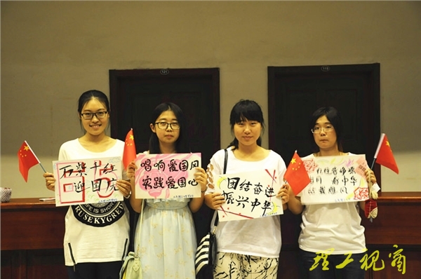入场时,同学们积极参与“我和祖国合个影•我给祖国说句话”活动,表达对祖国的美好祝福。“与国旗大合影”活动正式拉开了晚会的帷幕,一面巨大的国旗伴随着主持人激昂的解说和《五星红旗》的乐曲,从礼堂中心缓缓展开,最后定格在观众席中央,全场观众起立,向国旗致敬,与国旗一起大合影。