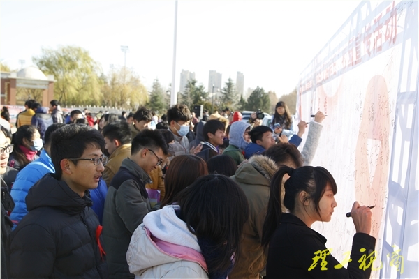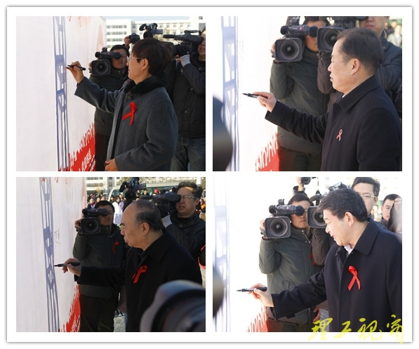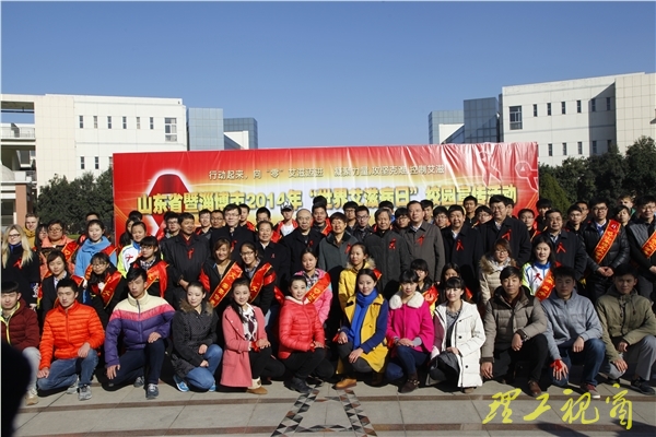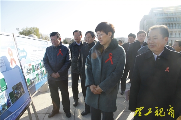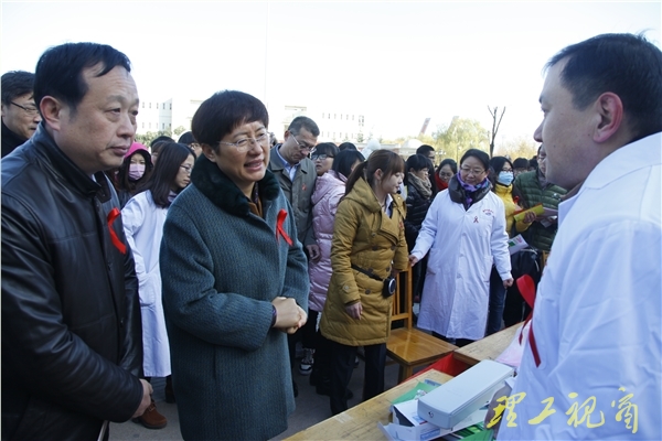 王随莲副省长和陪同人员一起佩戴红绸带,视察了山东省暨淄博市艾滋病防治工作展,观看了我校学生表演的“防艾”情景剧 《“艾”需要拥抱》,与现场的医务工作者、学生志愿者亲切交谈。在活动现场,志愿者宣读了倡议书、发放宣传材料,号召大学生应增强社会责任感和自律意识,防治艾滋;医务人员展开义诊、咨询等。活动结束后,王随莲带头在签名墙上签下自己的名字,并与大家合影留念。
